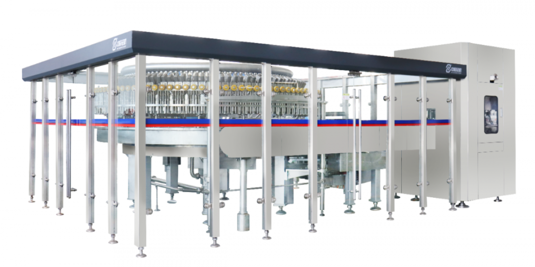 在组合机极小的占地面积上,集成12头冲瓶(罐)机、9头灌装机、1头压盖机和1头封机;灌装实现电子阀等压灌装,触摸屏便捷调整单个灌装阀;压盖机同时兼容拉环盖压盖机;封罐机采用伺服控制技术,卷封高效可靠。