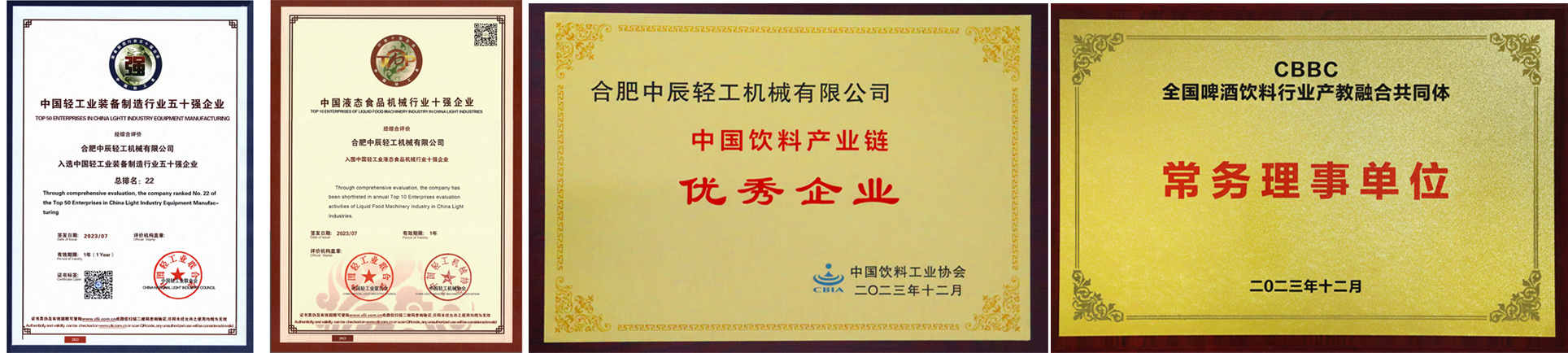 中辰轻机荣膺“中国轻工业装备制造行业五十强企业”和“中国液态食品机械行业十强企业”的荣誉称号;10月中辰轻机荣评为“省级服务型制造示范企业”;11月中辰轻机被认定为 “2023 年安徽省技术创新示范企业”;12月,中辰轻机荣获了“中国饮料产业链优秀企业”称号。同期,中辰轻机当选为全国啤酒饮料行业产教融合共同体常务理事单位,彰显了啤酒、饮料等行业和协会,政府以及相关组织,对中辰轻机近年来发展成绩的充分肯定与认可。
