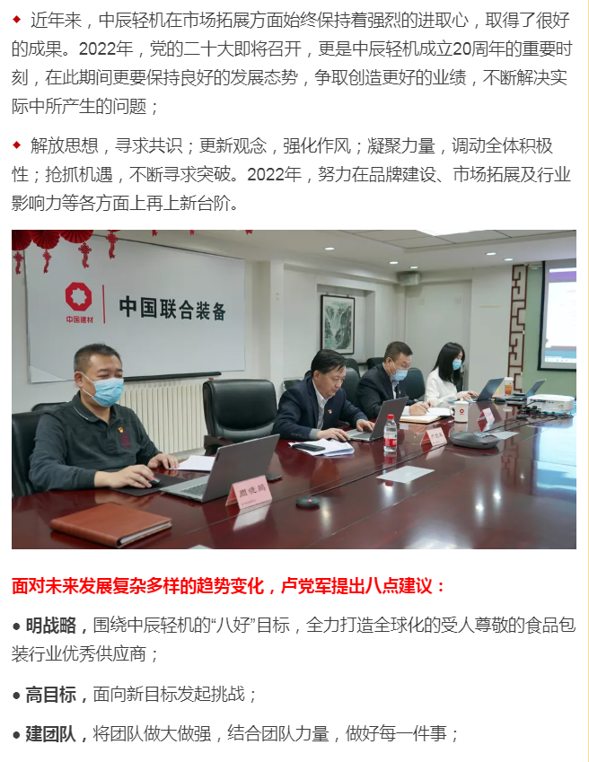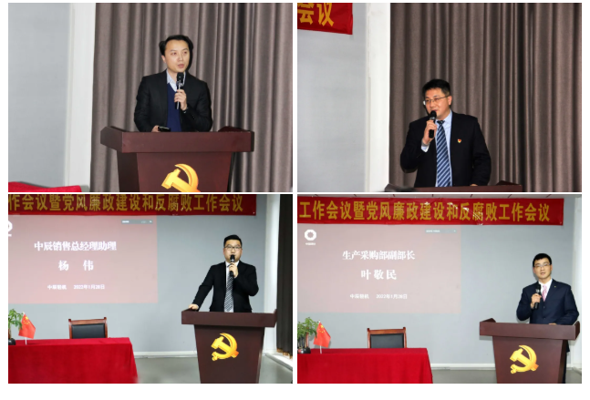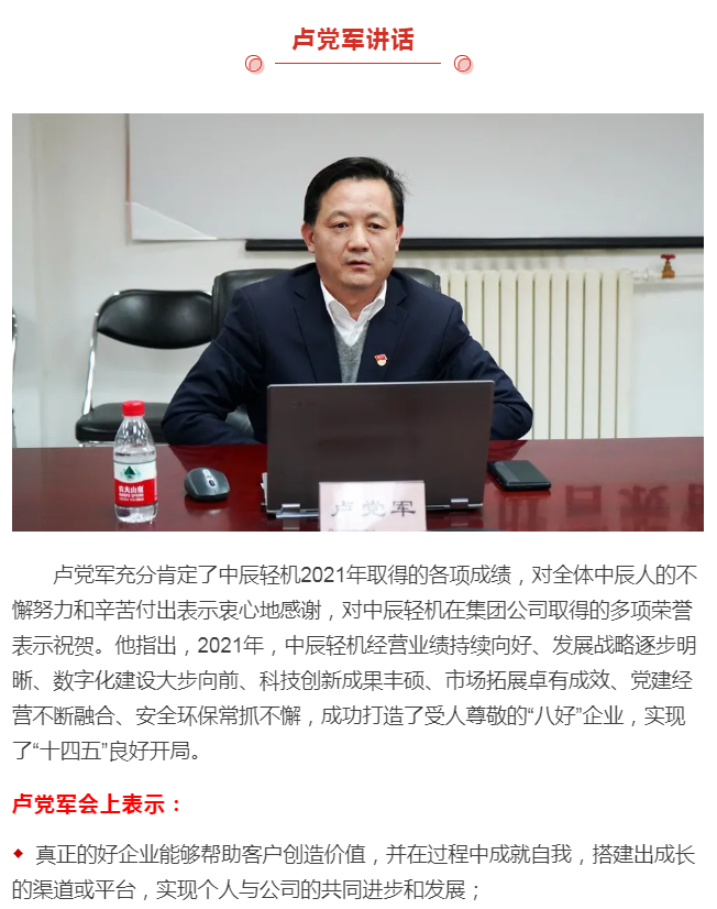 On the afternoon of January 28, Hefei Light Machinery and Zhongchen Light Machinery held their annual work conference and party风 and anti-corruption work conference. Lu Dangjun, the Party Secretary, Chairman, and General Manager of China United Equipment, attended the meeting via video and delivered an important speech. Liu Baosheng, the Party Committee member and Secretary of the Discipline Inspection Commission of China United Equipment, and Zhou Xiaopeng, Director of the Department of Enterprise Management, and Kang Zixuan, Deputy Director of the Department of Administration and Personnel, attended the meeting. Gao Yibing, the Party Committee member and Production Director of Zhongchen Light Machinery, presided over the meeting.