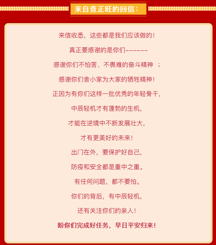 The Party committee, trade union, and leaders of various departments of Zhongchen Light Machinery visited and expressed their New Year greetings to the families of employees who were working at clients' sites to install and debug equipment, bringing them the care and greetings of the organization. This warmth at the end of the year and the beginning of the year made the employees and their families who were fighting on the front line of clients feel relieved and greatly boosted and solidified the work confidence of all cadres and employees. Many of them sent thank-you letters to Chairman, President, and General Manager Zha Zhengwang. In the letters, they expressed that they would practice the corporate culture of Zhongchen Light Machinery and embody the work philosophy of "loving Zhongchen Light Machinery is loving oneself, and loving oneself means loving Zhongchen Light Machinery" in their actual work.