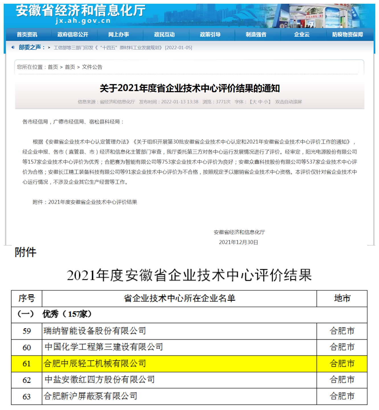 On December 30, 2021, the Anhui Provincial Department of Economy and Information Technology released the "Notice on the Evaluation Results of Anhui Provincial Enterprise Technology Center in 2021". Zhongchen Light Machinery stood out among the 1538 participating enterprises in the province and was named "Anhui Province Excellent Enterprise Technology Center". Only 157 enterprises were selected as excellent in this evaluation.